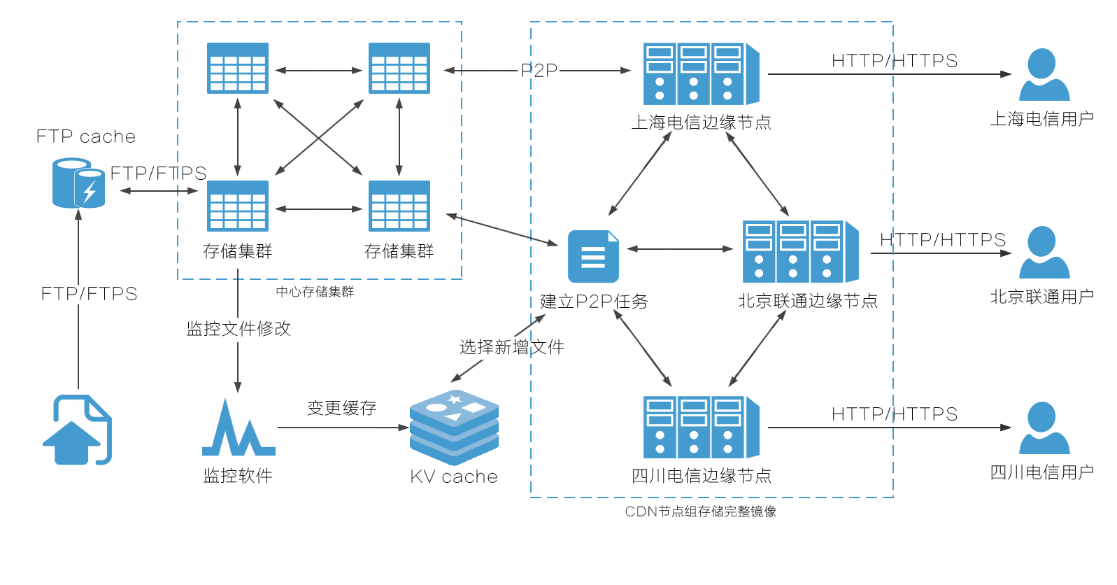 傳統(tǒng)CACHE方式在未緩存的情況下存在回源慢的問題,我們第一次上傳就會全部鏡相到所有節(jié)點上,最大化提升速度